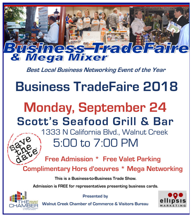 We are excited to invite you to come and meet us at the Walnut Creek Business Trade fair on Monday, 24th September. The event will take place from 5 pm to 7 pm at Scott’s Seafood Bar & Grill, 133 N. California Blvd, in Walnut Creek.